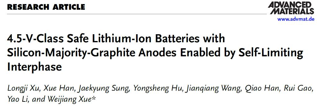 以上工作成果以《自限性界面赋能4.5 V级高硅负极高安全锂离子电池》(“4.5-V-class safe lithium-ion batteries with silicon-majority-graphite anodes enabled by self-limiting interphase”)为题,发表于国际权威杂志《先进材料》(Advanced Materials)。成人直播