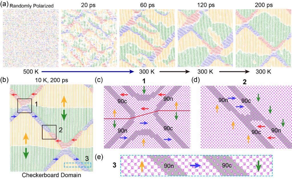 进一步通过高温退火模拟,团队发现了Bi烯具有独特的“畴对交织”的棋盘状拓扑畴结构(一组极化相反铁电畴称为一个“畴对”)。其中,180°带电畴界决定了两组正交铁电畴对的形成,而90°畴界则为不同畴对之间的转变提供了媒介(图2)。此外,研究中观察到的四种不同方向铁电畴交汇处形成的涡旋拓扑畴结构,具有优异的拓扑稳定性。本项研究首次在单质二维铁电体中揭示了由带电畴界主导的拓扑畴结构及其动态演化规律,为理解与设计新型铁电拓扑材料提供了全新的理论基础与实现路径,有望在高密度数据存储、神经形态计算、量子器件及柔性电子等领域获得应用。